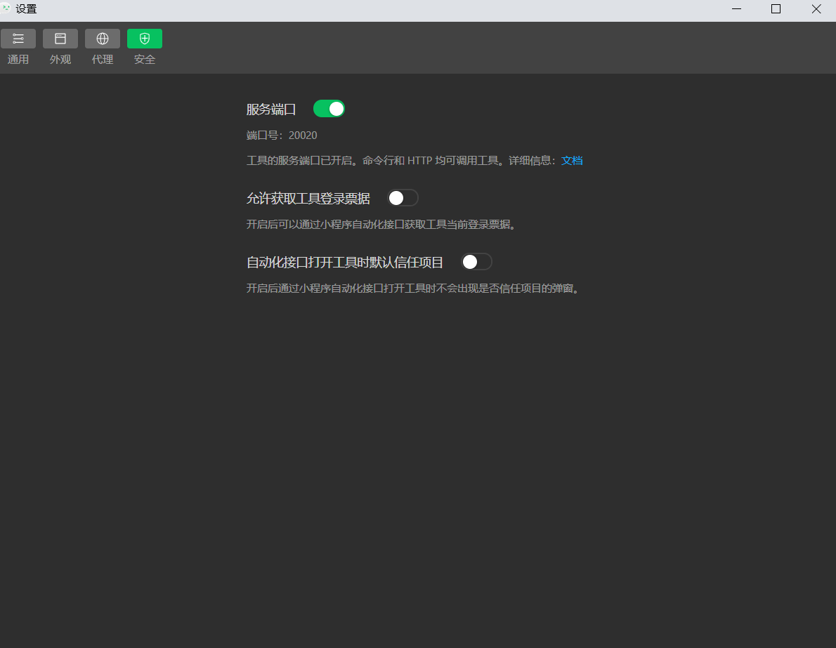 下载后在微信开发者工具中的设置->安全中开启服务端口 :