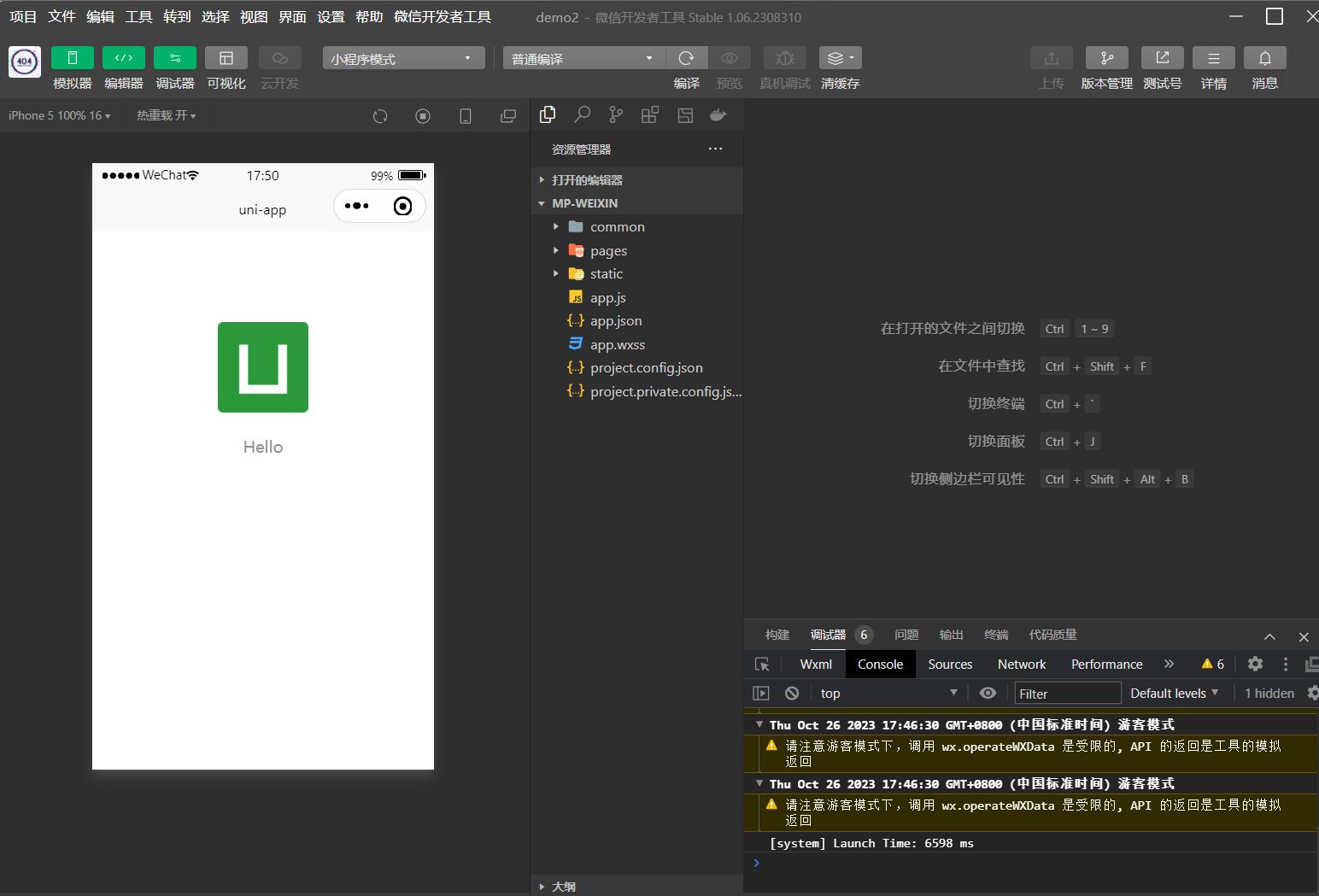 进入刚才创建的项目,点击工具栏的运行 -> 运行到小程序模拟器 -> 微信开发者工具,即可在微信开发者工具里面体验uni-app。