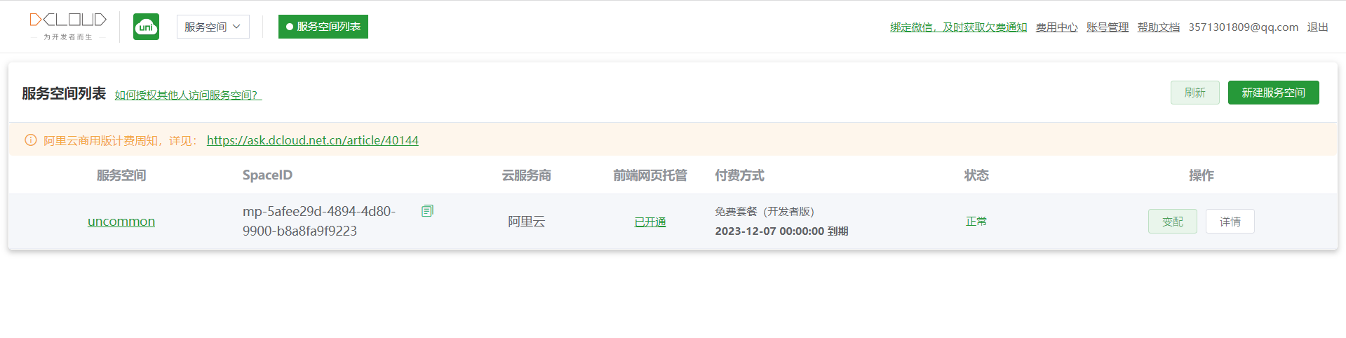 在uniCloud 的 web 控制台选择你创建好的服务空间