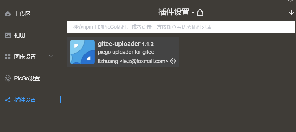 在PicGo的【插件设置】中搜索gitee-uploader插件并安装