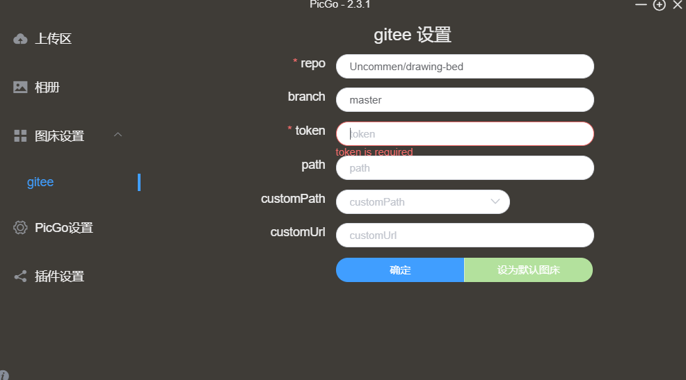 - repo:用户名/仓库名称,比如我自己的仓库Uncommon/drawing-bed,这里的仓库要自己在Gitee创建一个开源仓库。
