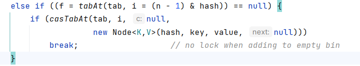 我们可以看到,当通过 (f = tabAt(tab, i = (n - 1) & hash)) == null 判断数组索引位置上没有数据时,就会通过casTabAt方法将Node结点直接加进去:
