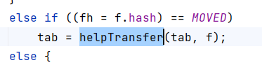 可以看到,如果结点的hash值为MOVED也就是-1,就认为当前数组正在扩容,就会调用helpTransfer方法协助扩容: