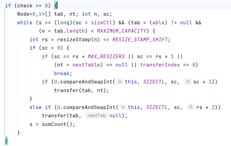 | private final void addCount(long x, int check) { CounterCell[] as; long b, s; if ((as = counterCells) != null || !U.compareAndSwapLong(this, BASECOUNT, b = baseCount, s = b + x)) { CounterCell a; long v; int m; boolean uncontended = true; if (as == null || (m = as.length - 1) < 0 || (a = as[ThreadLocalRandom.getProbe() & m]) == null || !(uncontended = U.compareAndSwapLong(a, CELLVALUE, v = a.value, v + x))) { fullAddCount(x, uncontended); return; } if (check <= 1) return; s = sumCount(); } if (check >= 0) { Node<K,V>[] tab, nt; int n, sc; while (s >= (long)(sc = sizeCtl) && (tab = table) != null && (n = tab.length) < MAXIMUM_CAPACITY) { int rs = resizeStamp(n) << RESIZE_STAMP_SHIFT; if (sc < 0) { if (sc == rs + MAX_RESIZERS || sc == rs + 1 || (nt = nextTable) == null || transferIndex <= 0) break; if (U.compareAndSwapInt(this, SIZECTL, sc, sc + 1)) transfer(tab, nt); } else if (U.compareAndSwapInt(this, SIZECTL, sc, rs + 2)) transfer(tab, null); s = sumCount(); } } }