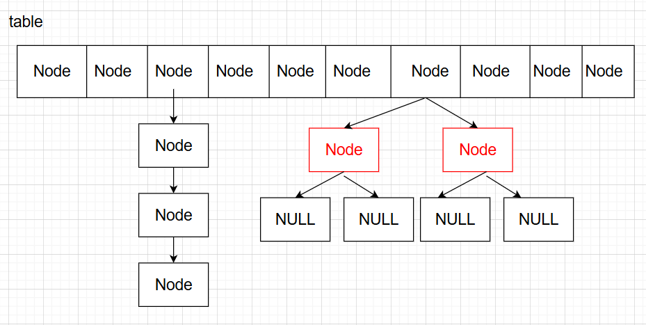 在理想情况下(没有哈希冲突)HashMap的操作时间复杂度可以达到O(1)。为了解决哈希冲突(也就是哈希值重复)的问题,HashMap在table数组中将哈希冲突的Node结点维护成链表或者红黑树。在JDK1.8前(不含JDK1.8),HashMap的数据结构是数组+链表,在JDK1.8及以后优化为数组+链表+红黑树。