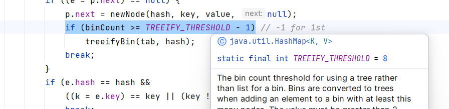 可以看到,在ptuVal方法中,如果链表结点数量超过7(因为一般情况下,链表节点数超过7,性能就会大幅下降),就会树化,调用treeifyBin函数:
