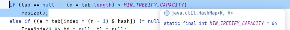 可以看到,会先监测数组长度,当数组长度小于64时并不会数化,而是调用resize方法进行扩容!为什么呢?