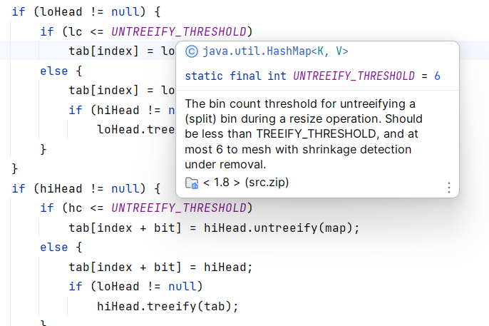 可以看到,调用split方法重构树时,如果树的结点数小于等于6,就会调用untreeify方法进行链表化,这是因为,当结点数小于等于6时,树提供的操作效率已经无法弥补它占用的大量空间,此时需要对时间与空间进行妥协,将树转为链表。那么为什么是小于等于6,而不是小于等于7呢?
